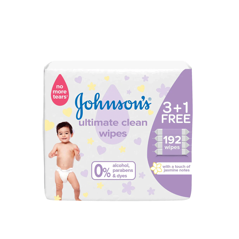 احصلي على نظافة فائقة وراحة مثالية لبشرة طفلك مع جونسون مناديل أطفال للنظافة الفائقة. عرض 3+1 يشمل 192 منديل ناعم وآمن لجميع أنواع البشرة.